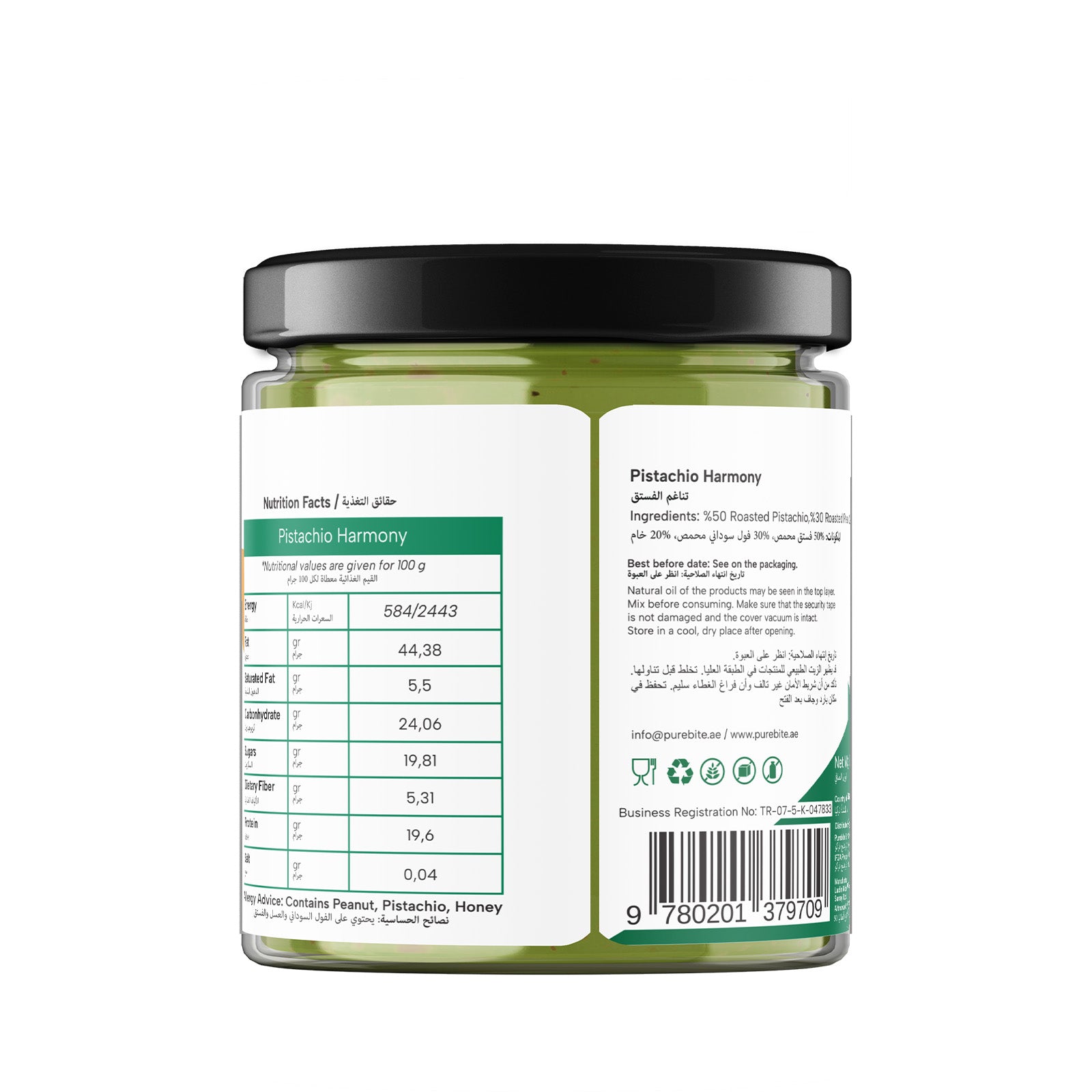 At Purebite, we proudly present Pistachio Harmony, our newest all‑natural spread crafted with passion and precision. Made with a perfect blend of premium Antep pistachios, high‑quality peanuts, and pure honey, this creamy nut butter delivers an unrivaled taste experience. What sets it apart is its simplicity: only three wholesome ingredients are used—without any added sugar, oil, or preservatives—ensuring a product that is as healthy as it is delicious.